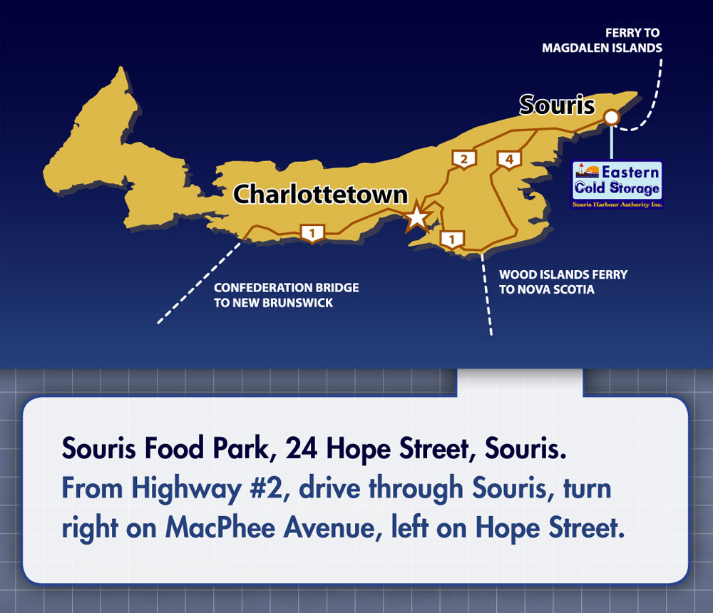 Eastern Cold Storage is a public refrigerated warehouse facility, owned by the Souris Harbour Authority Inc., created to service the needs of fishers to blast freeze and store bait as well as area and regional seafood, fruit and vegetable processors. We provide state of the art blast freezing and cold storage for a wide variety of individuals and companies.